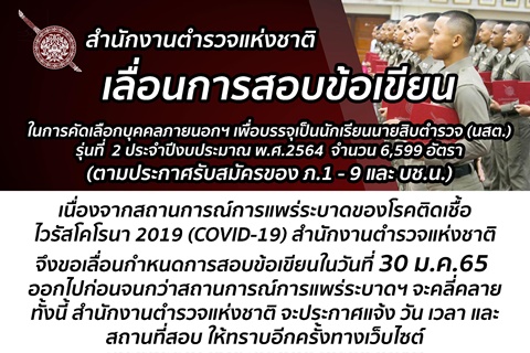 ข่าวสารประชาสัมพันธ์ สำนักงานตำรวจแห่งชาติ เลื่อนการสอบข้อเขียนในการคัดเลือกบุคคลภายนอก เป็นนักเรียนนายสิบตำรวจ (นสต.) พ.ศ. 2564 รุ่นที่ 2 เนื่องจากสถานการณ์โรคติดเชื้อไวรัสโคโรนา 2019 10 กุมภาพันธ์ 202210 กุมภาพันธ์ 2022 admin 0 Comments Facebook Comments