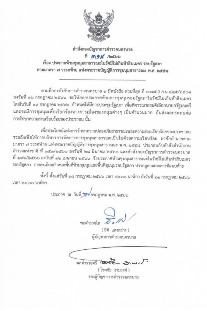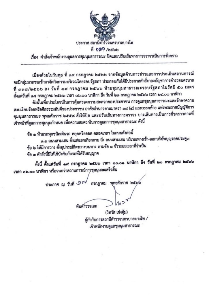ข่าวสารประชาสัมพันธ์ ปรับเส้นทางการจราจร บางเส้นทางเป็นการชั่วคราวตามที่เจ้าหน้าที่ดูแลการชุมนุมกำหนด เพื่อความสะดวกในการดูแลการชุมนุมสาธารณะ 19 ก.ค.66 18 กรกฎาคม 202318 กรกฎาคม 2023 admin 0 Comments เนื่องด้วยวันพุธที่ 19 ก.ค.66 จากข้อมูลการข่าวฯ จะมีมวลชนเข้ามาจัดกิจกรรมบริเวณโดยรอบรัฐสภา เพื่อประโยชน์ในการคุ้มครองความสะดวกของประชาชน การดูแลชุมนุมสารธารณะและรักษาความปลอดภัย ปรับเส้นทางการจราจร บางเส้นทางเป็นการชั่วคราวตามที่เจ้าหน้าที่ดูแลการชุมนุมกำหนด เพื่อความสะดวกในการดูแลการชุมนุมสาธารณะ ดังนี้ #ข้อ 1 ห้ามรถทุกชนิดเดินรถ หยุดหรือจอด ตลอดเวลา ในถนนดังต่อนี้ 1.1 ถนนสามเสน ตั้งแต่แยกเกียกกาย ถึง ถนนสามเสน บริเวณทางเข้า-ออกบริษัทบุญรอดประตู3 #ข้อ 2 ให้มีการวาง ตั้งอุปกรณ์กีดขวางบนทาง ตามข้อ 1 ชั่วระยะเวลาที่จำเป็น #ข้อ 3 คำสั่งนี้มิให้ใช้บังคับกับรถที่ได้รับอนุญาต ทั้งนี้ ตั้งแต่วันที่ 19 กรกฎาคม 2566 เวลา 00.01 นาฬิกา ถึง วันที่ 20 กรกฎาคม 2566 เวลา 06.00 นาฬิกา หรือ จนกว่าสถานการณ์การชุมนุมจะเสร็จสิ้น