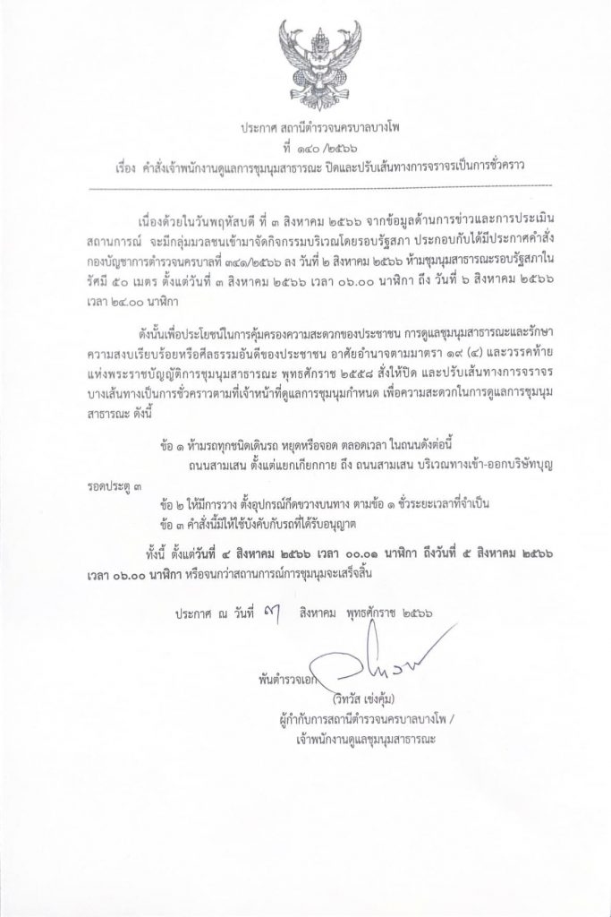 - ปรับเส้นทางการจราจร บางเส้นทางเป็นการชั่วคราวตามที่เจ้าหน้าที่ดูแลการชุมนุมกำหนด เพื่อความสะดวกในการดูแลการชุมนุมสาธารณะ 19 ก.ค.66
